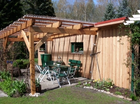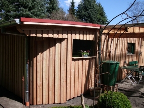 - Garagenverkleidung aus Lärchendeckel- schalung - Terrassenüberdachung aus Lichtplatten - Terrassenanbau aus KVH-Holz
